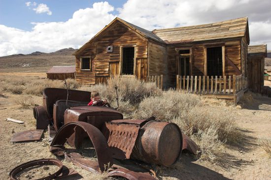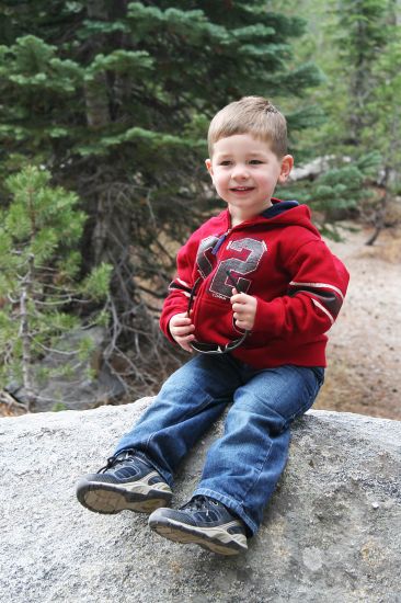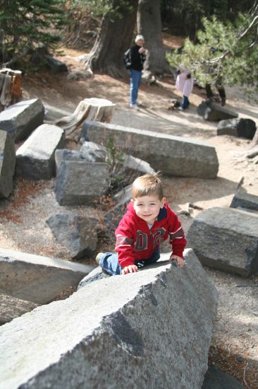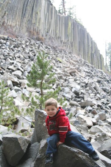 Cade on a rock in front of Devil's Postpile where the rocks are long columns.