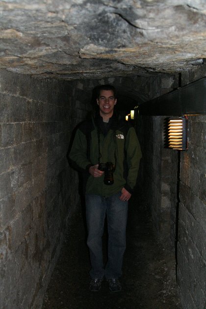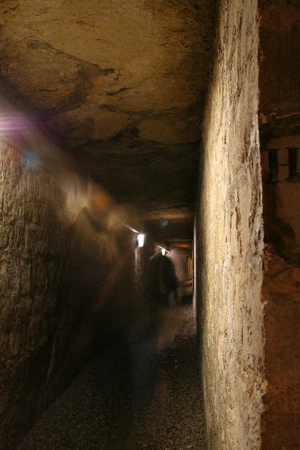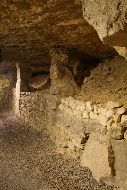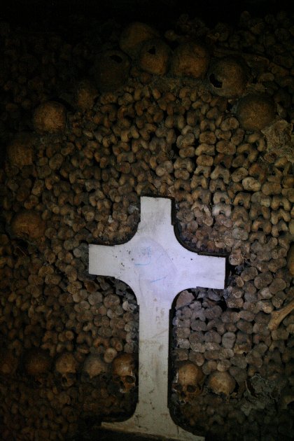 Femurs and skulls in a decorative wall holding back the rest of the bones.