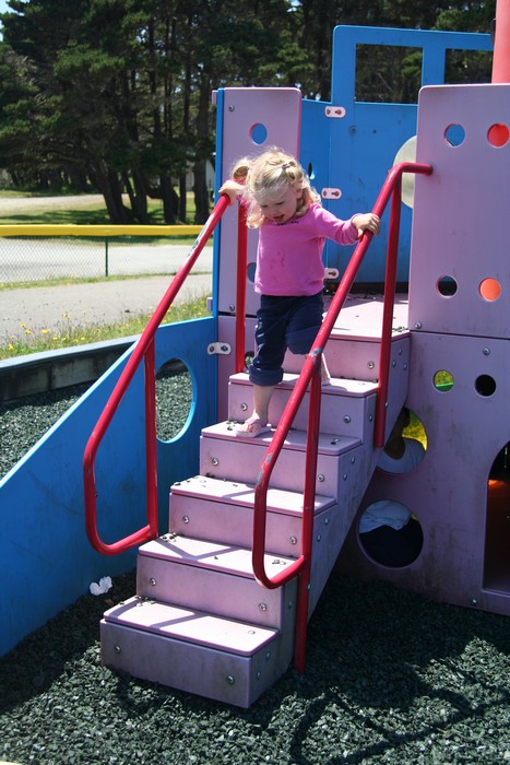 Claire going down steps, just her size.