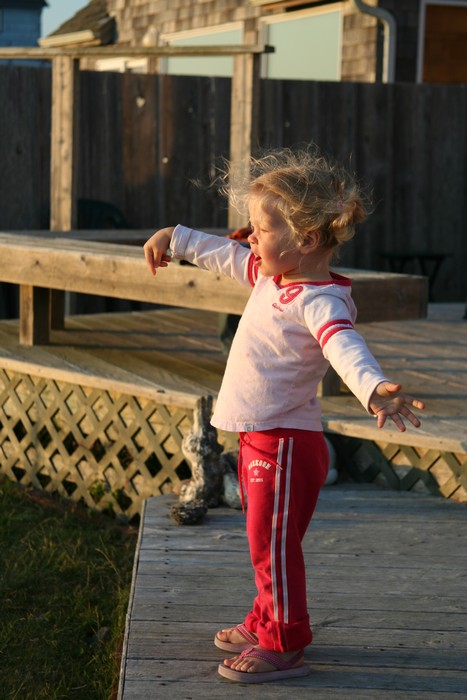 Claire throwing a ball off the deck.