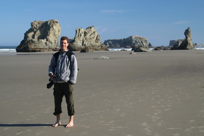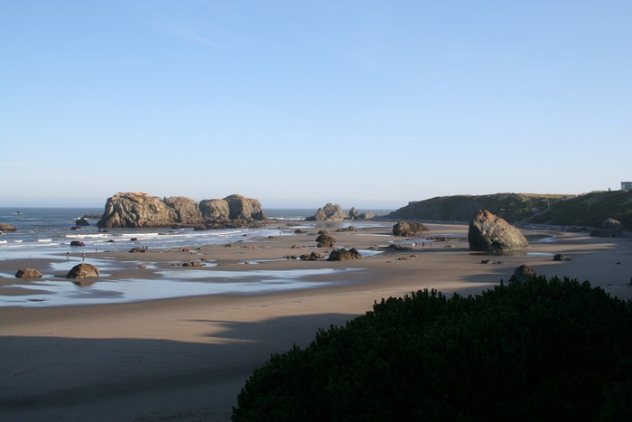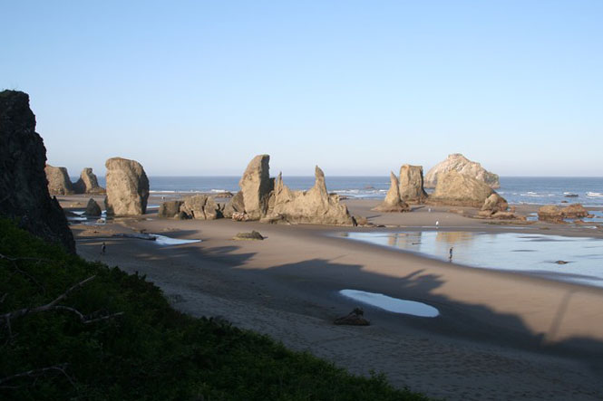 A view of Face Rock and the Kittens at low tide from Pirate's Cave.