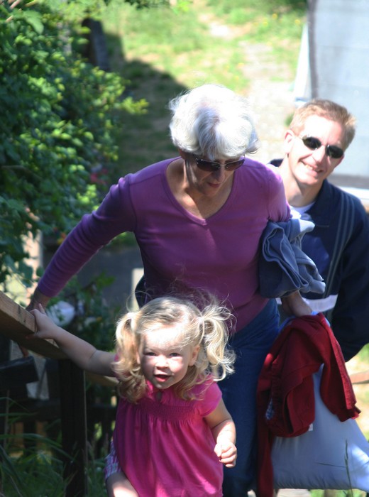 Claire climbing the stairs by herself while Mom and Andrew wait patiently.